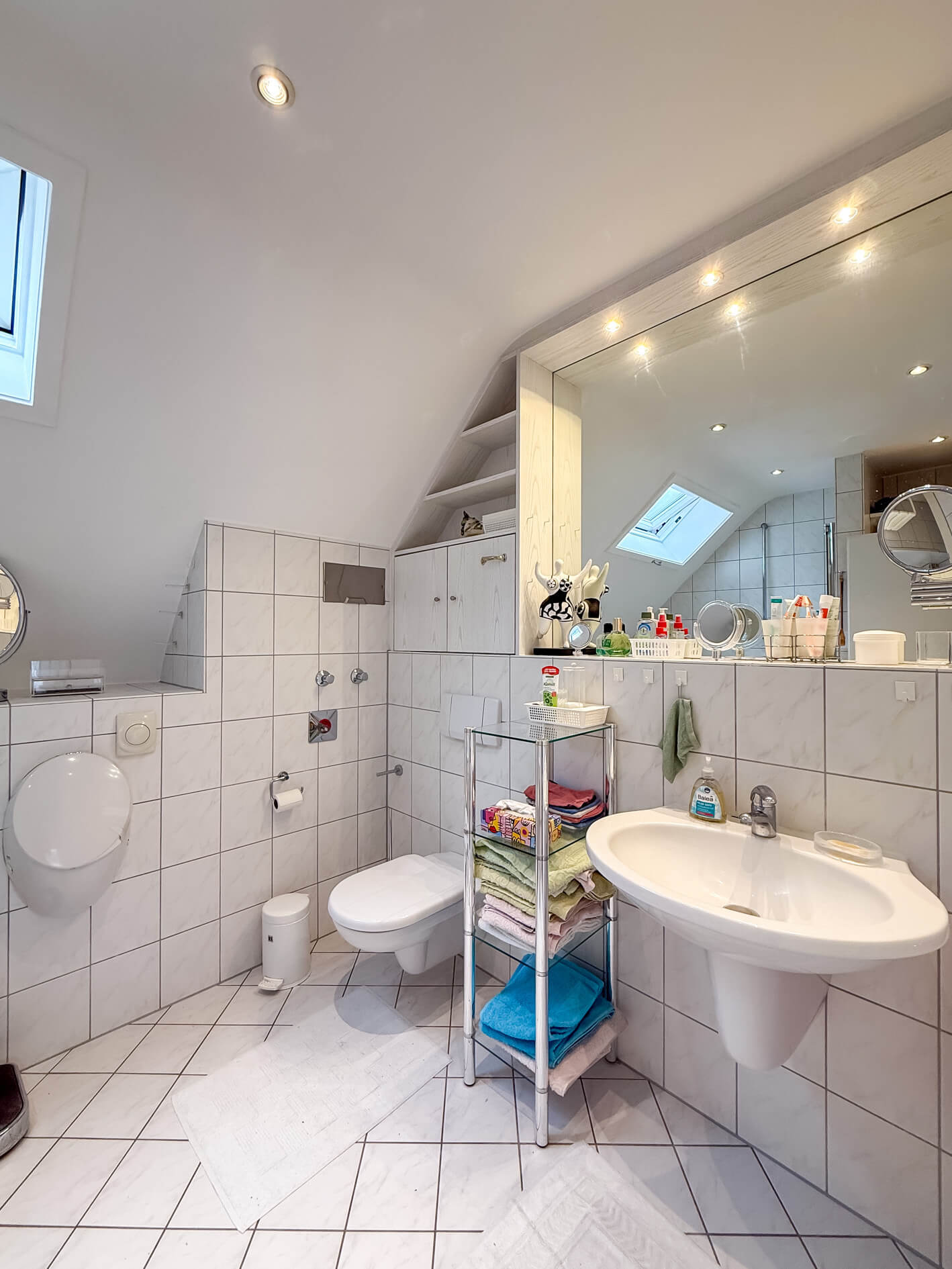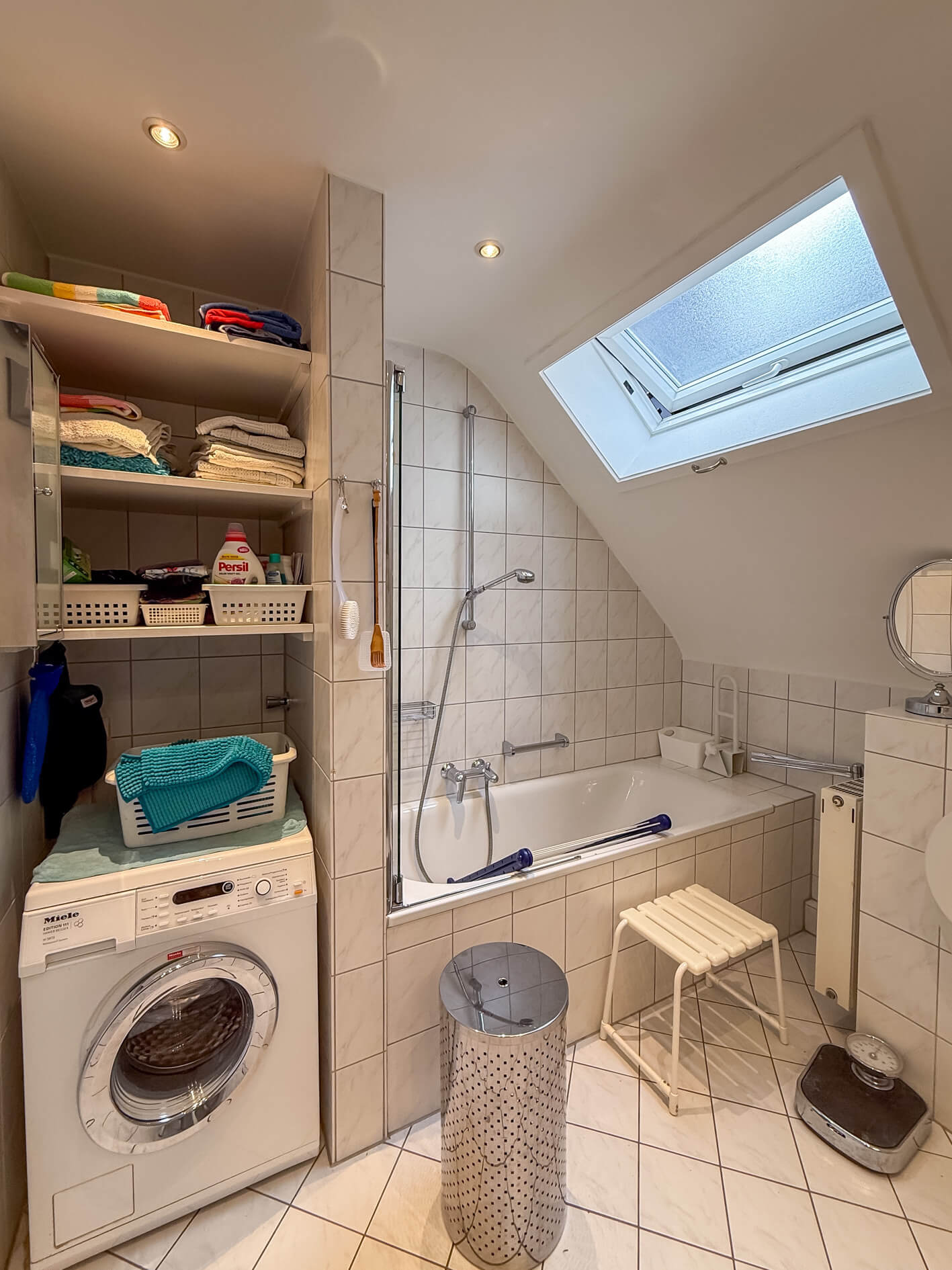Das Tageslichtbad mit Badewanne ist großzügig gestaltet und bietet u.a. viel Stauraum.
