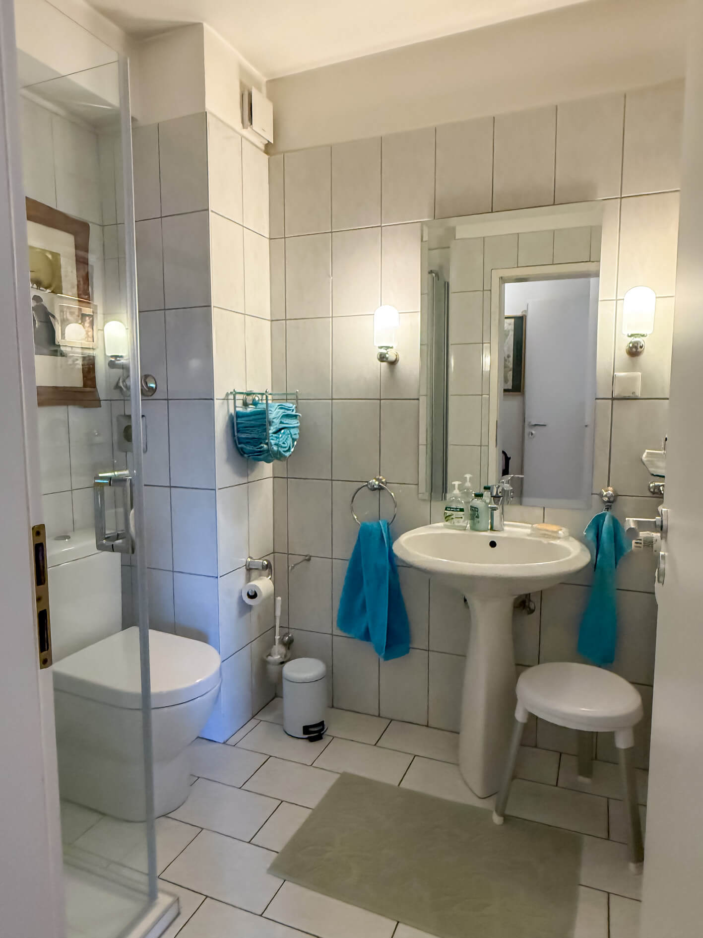 Auf der gleichen Ebene befinden sich ein Gäste Duschbad, dessen Dusche vor kurzem erneuert wurde und eine angrenzende Garderobe.
