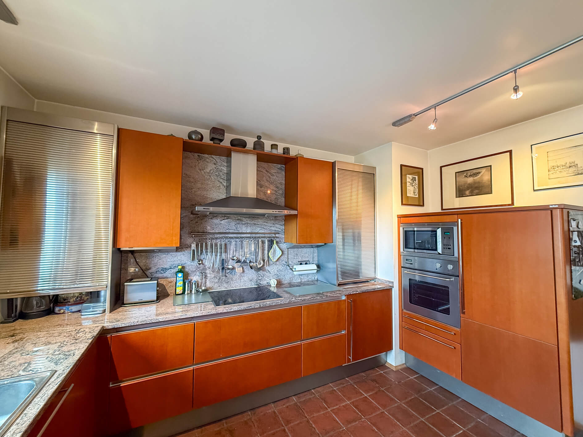 Die angrenzende Küche verfügt übereine großzügige Durchreiche, welche als eine Bar-/ oder als Tresen genutzt werden kann und ist mit einem dunklen Terracotta-Steinboden ausgestattet.