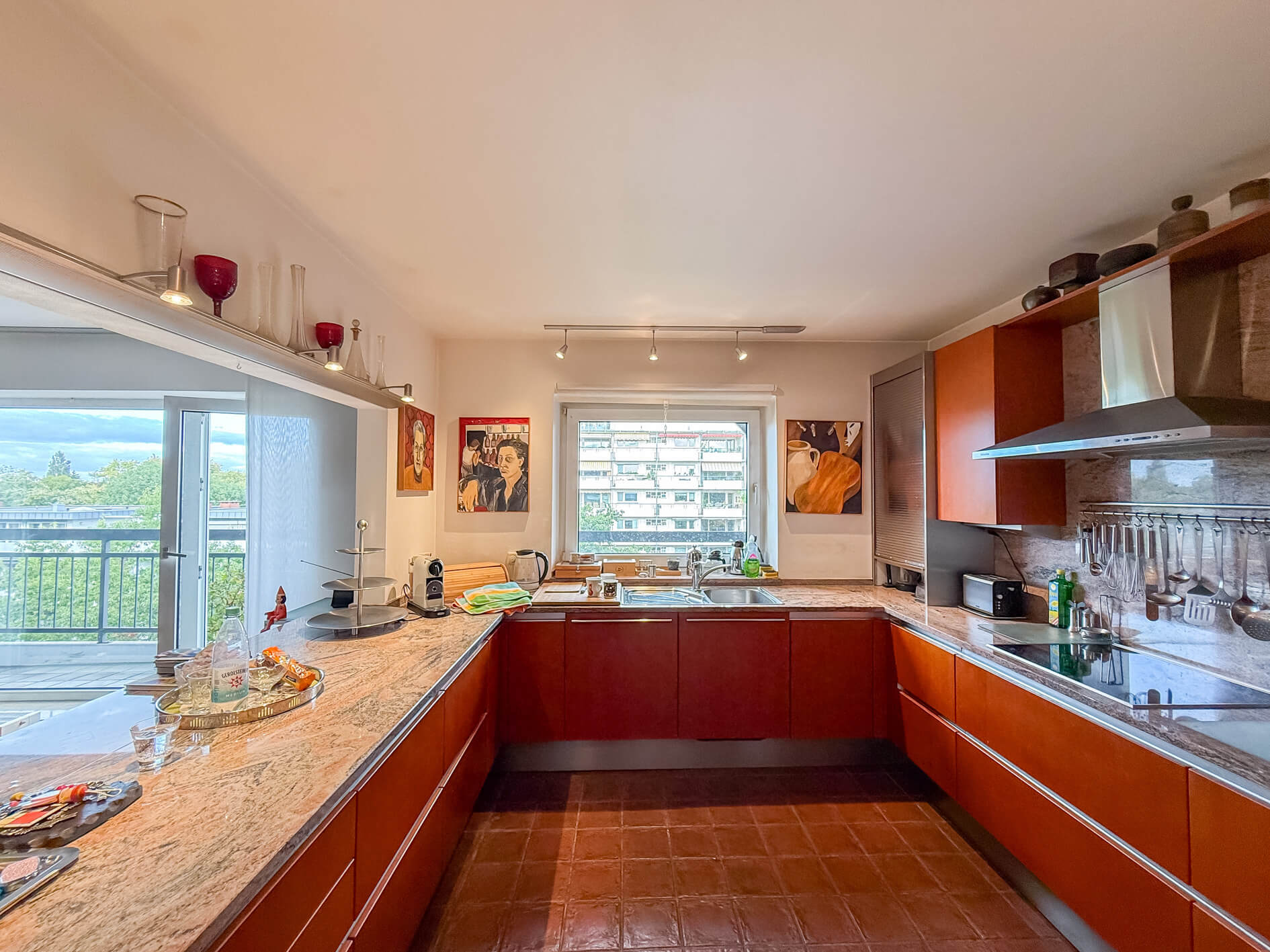 Des Weiteren bietet die Wohnung zwei Balkone, einen schmalen Balkon zur Straßenseite (vom Esszimmer aus zugänglich) und einen ca. 20 m² großen Süd-West-Balkon. Dieser ist mit gemauertem Außenkamin, separaten Abstellraum, und elektrischer Markise über die gesamte Fläche ausgestattet – ideal für Sommerabende und gesellige Runden im Freien.