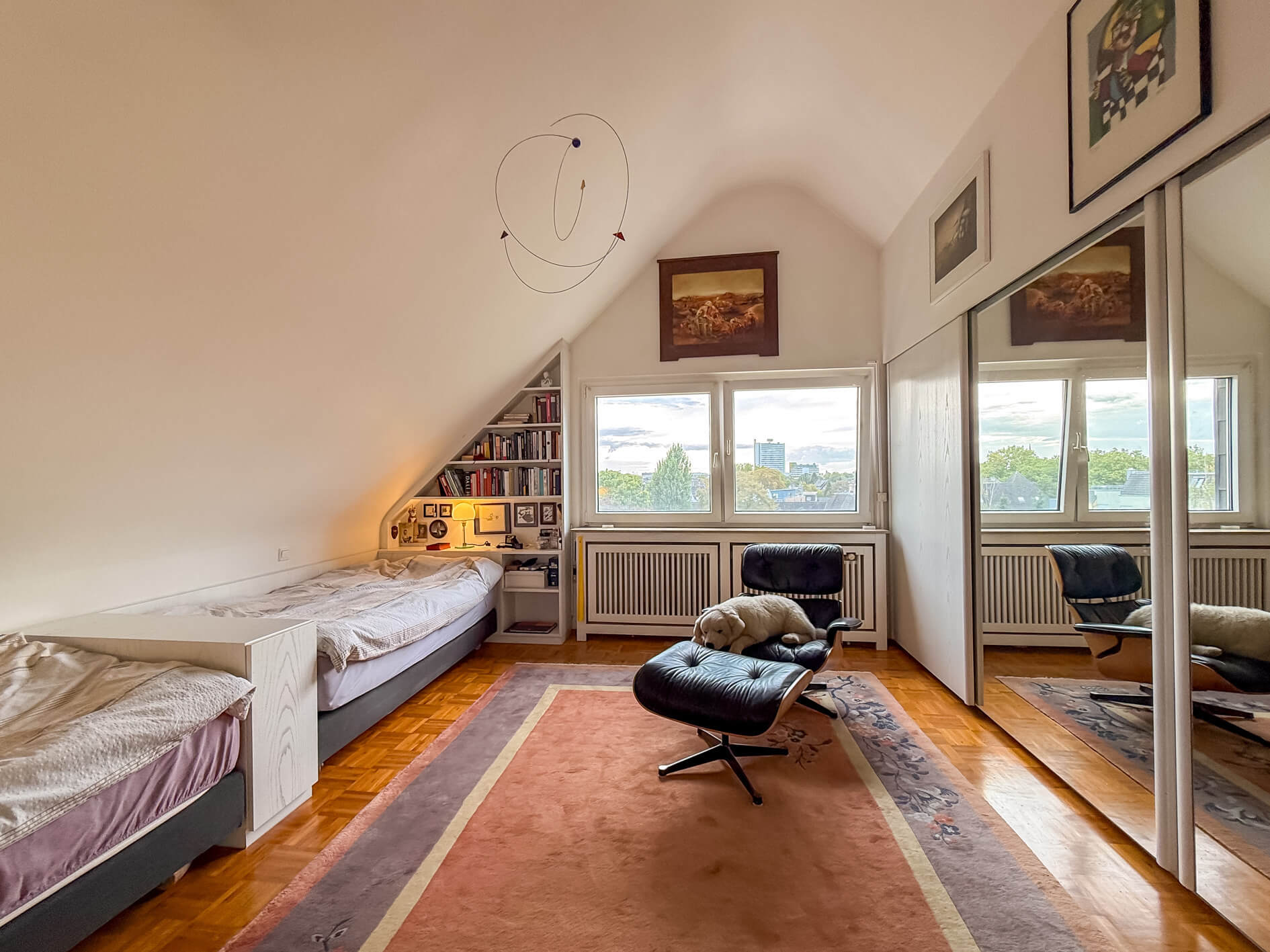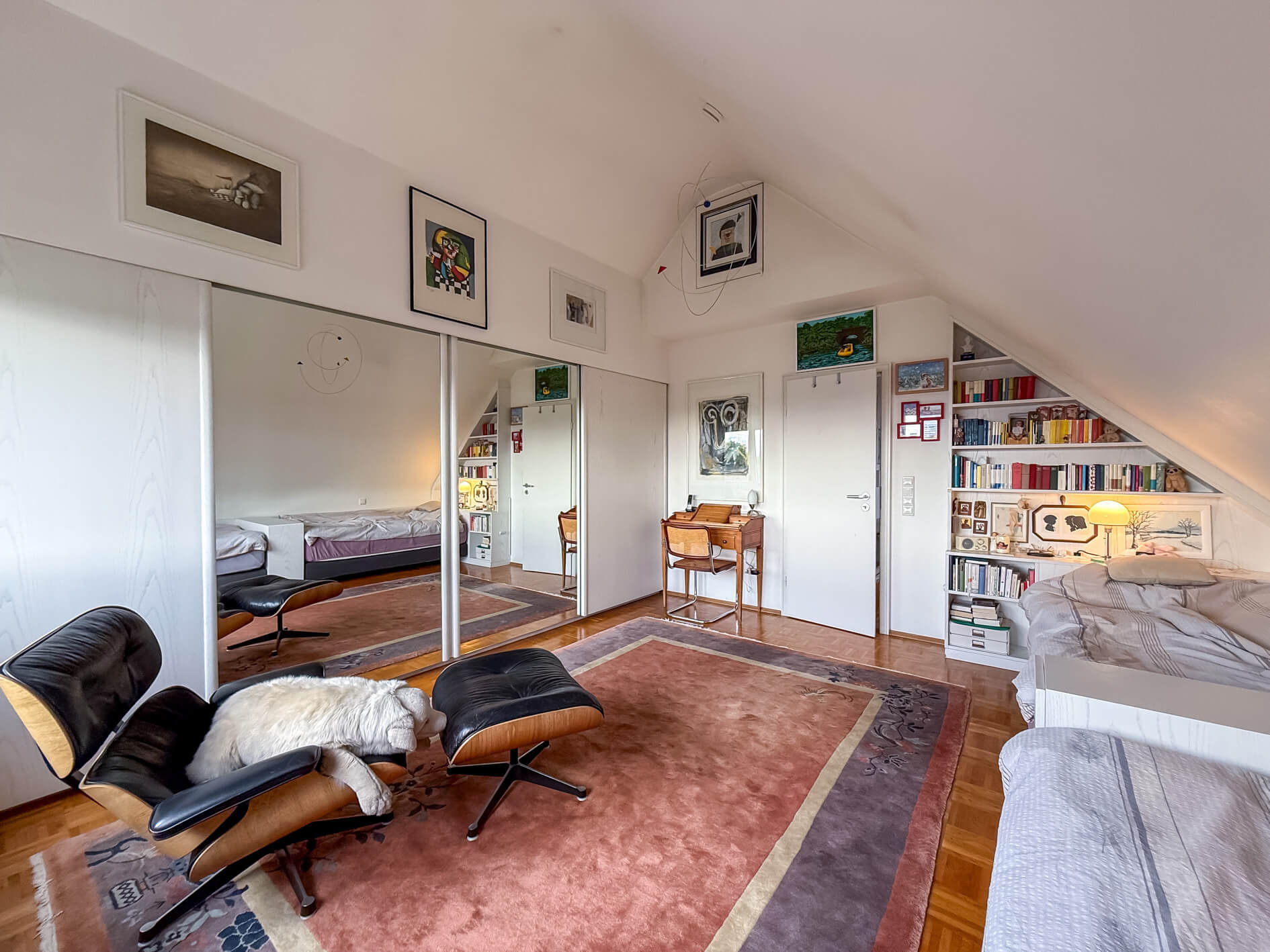 In der oberen Etage liegen die beiden Schlafzimmer die ebenfalls durchgehend mit Parkettboden ausgestattet sind. Das Elternschlafzimmer verfügt über einen begehbaren, hochwertigen Einbauschrank.