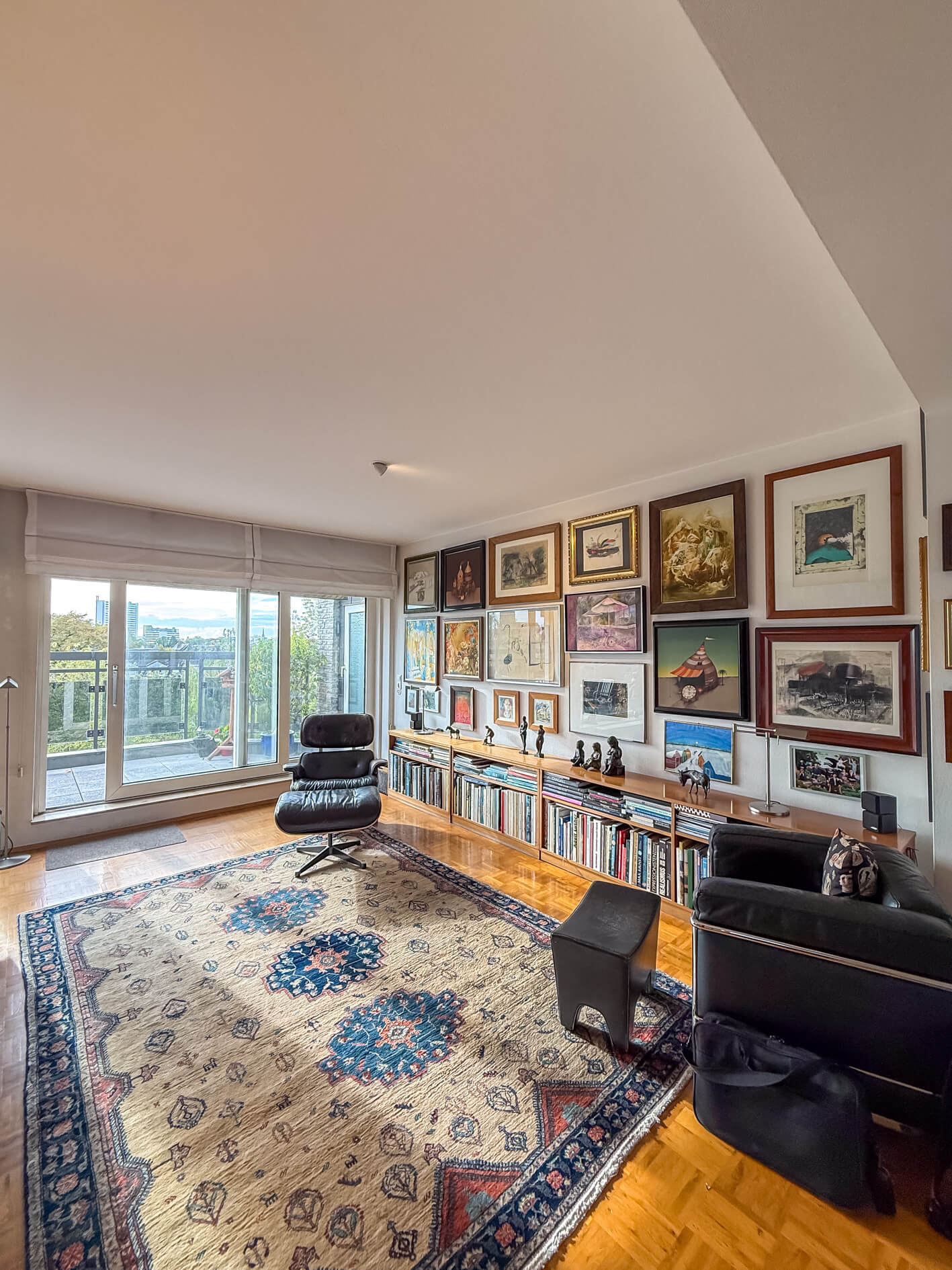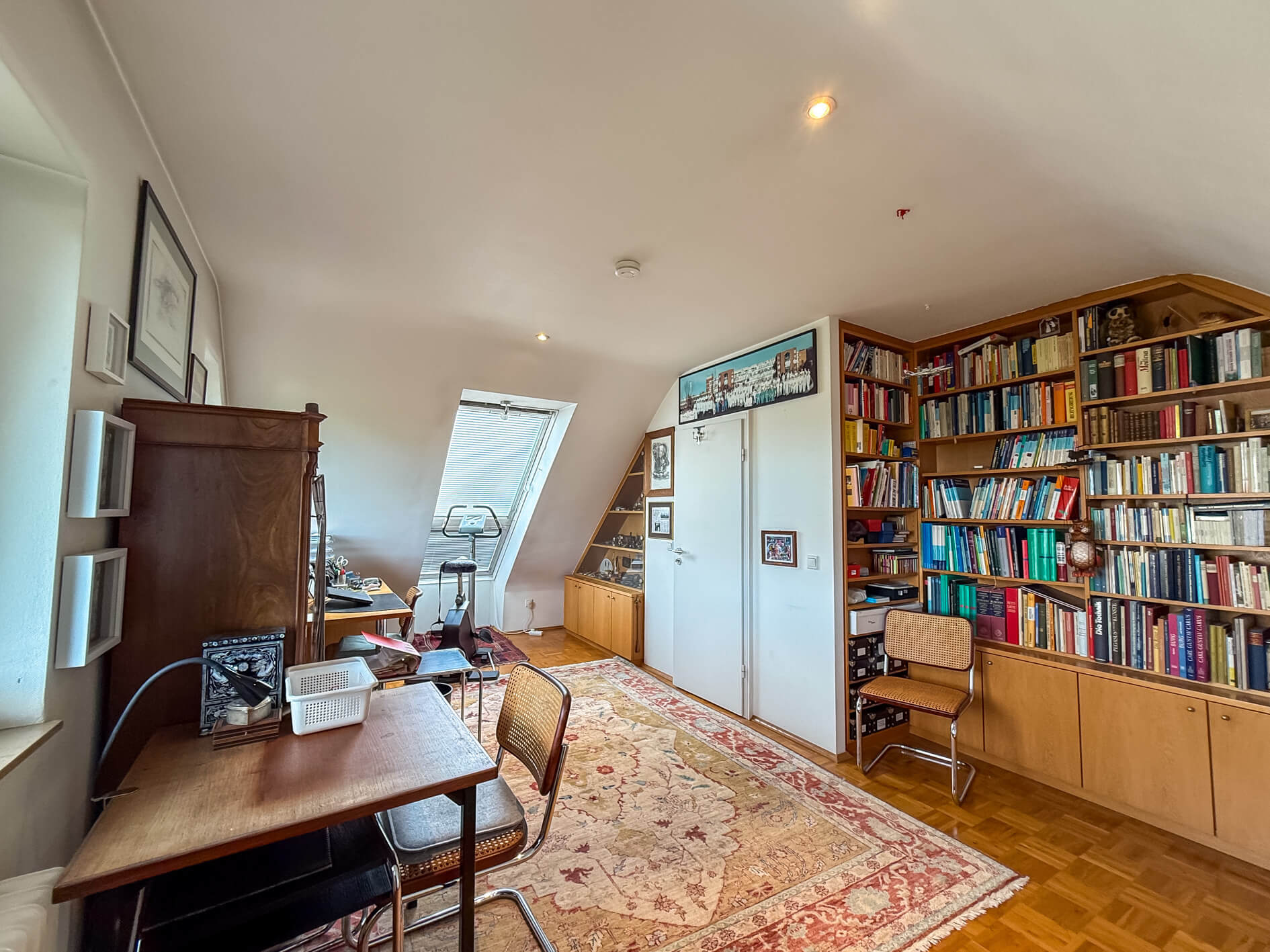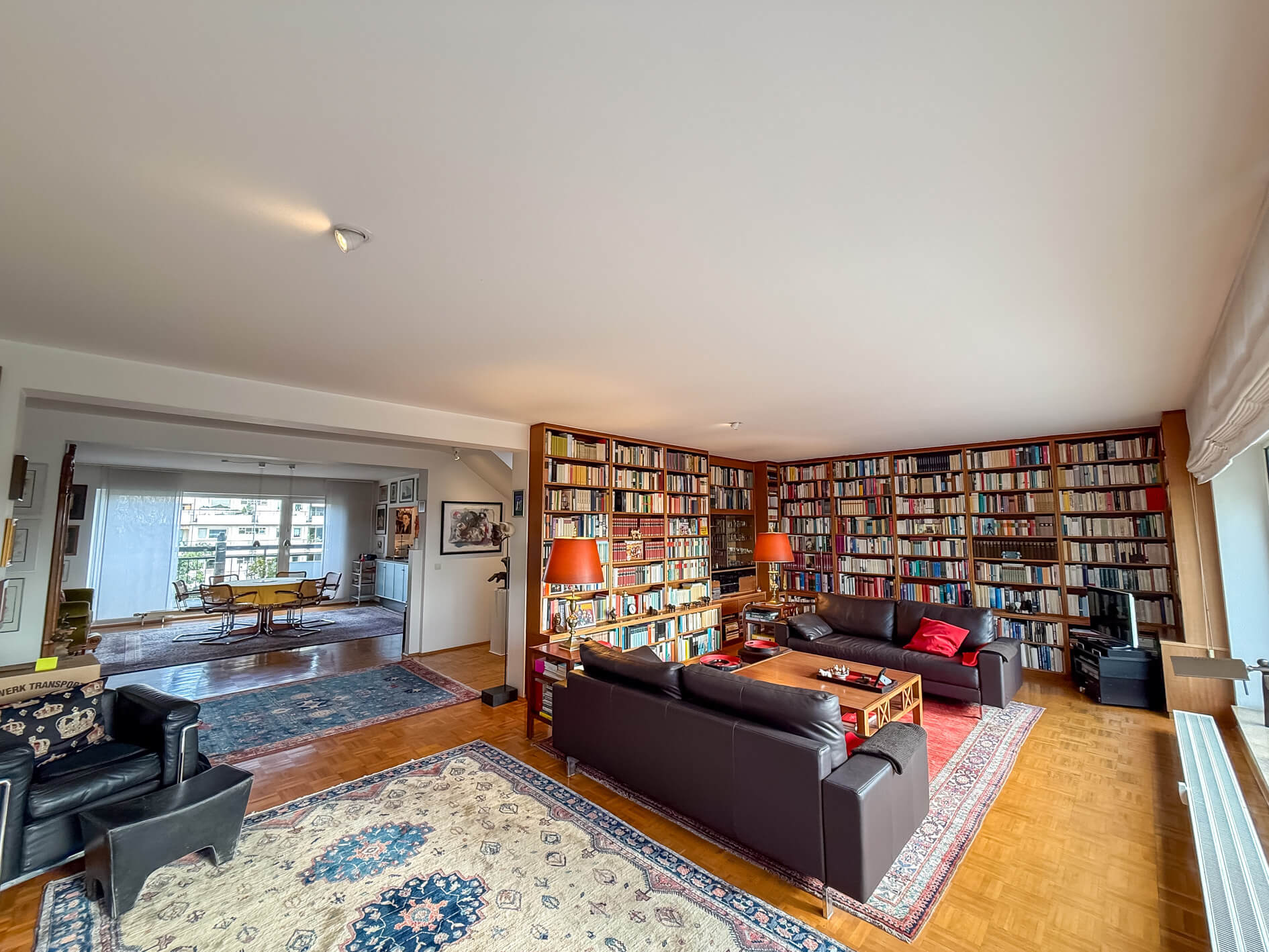 Hochwertiger Parkettboden unterstreicht das wohnliche Ambiente. Das Wohnzimmer ist mit maßgefertigten, massiven Einbauregalen ausgestattet und bietet viel Stauraum.