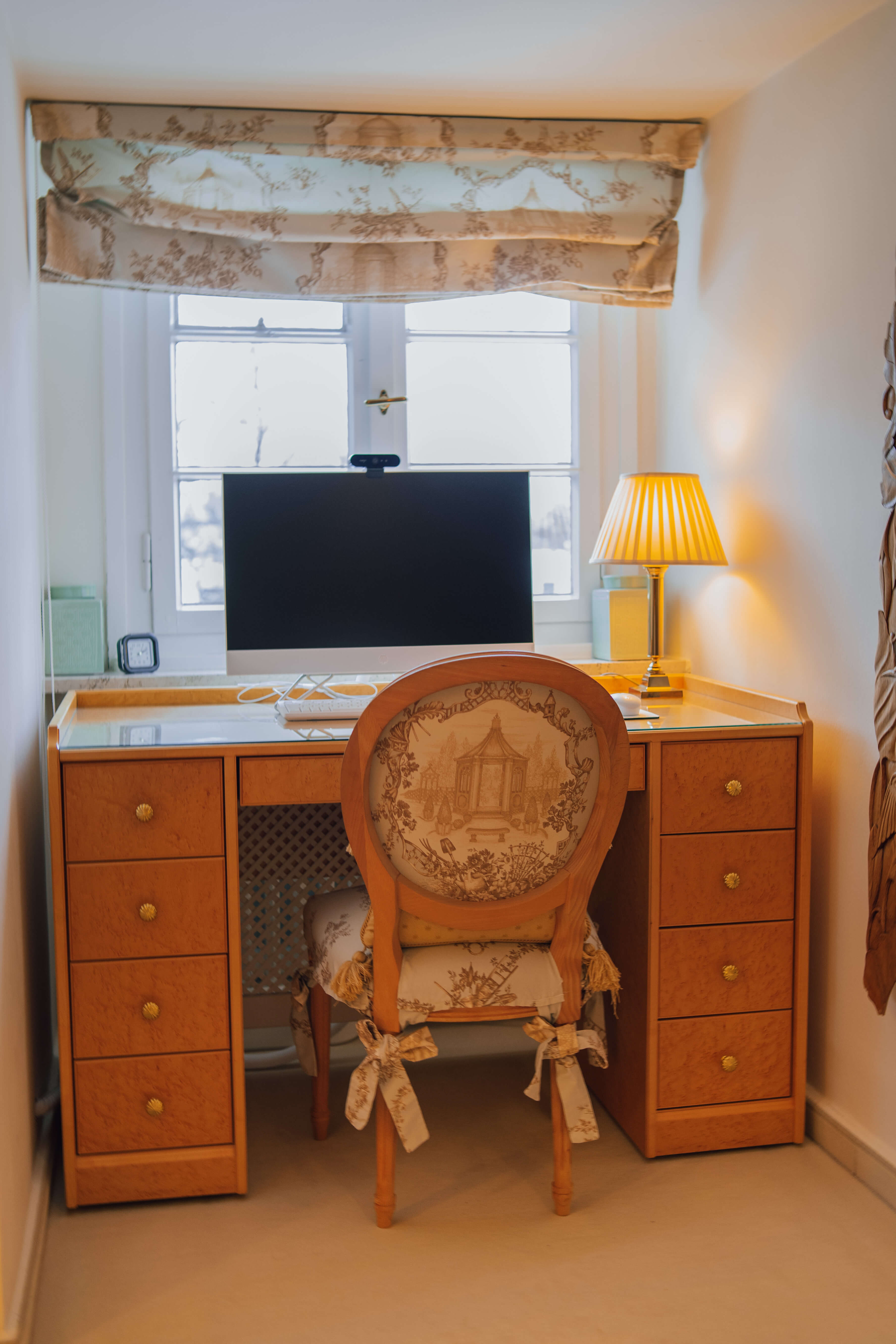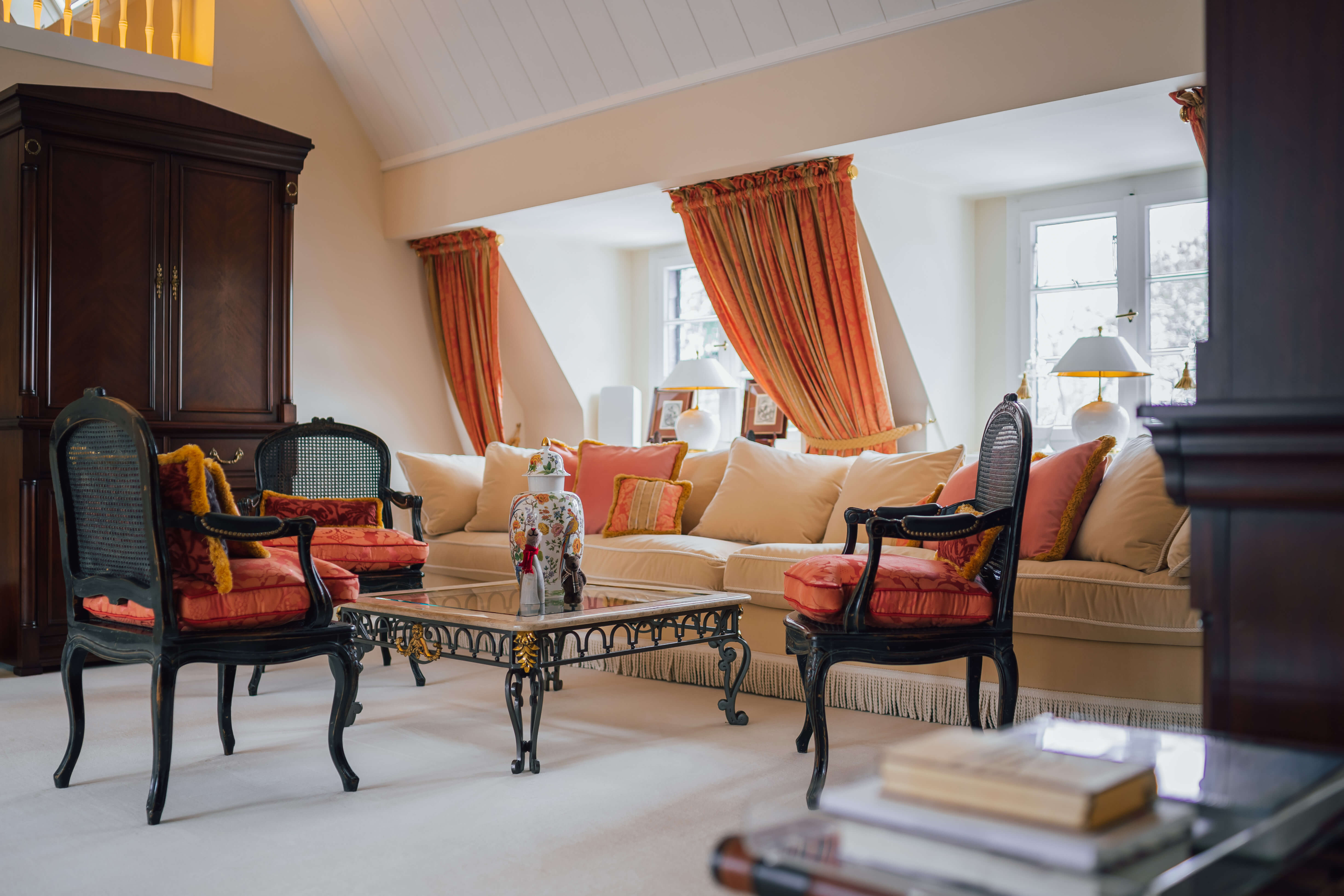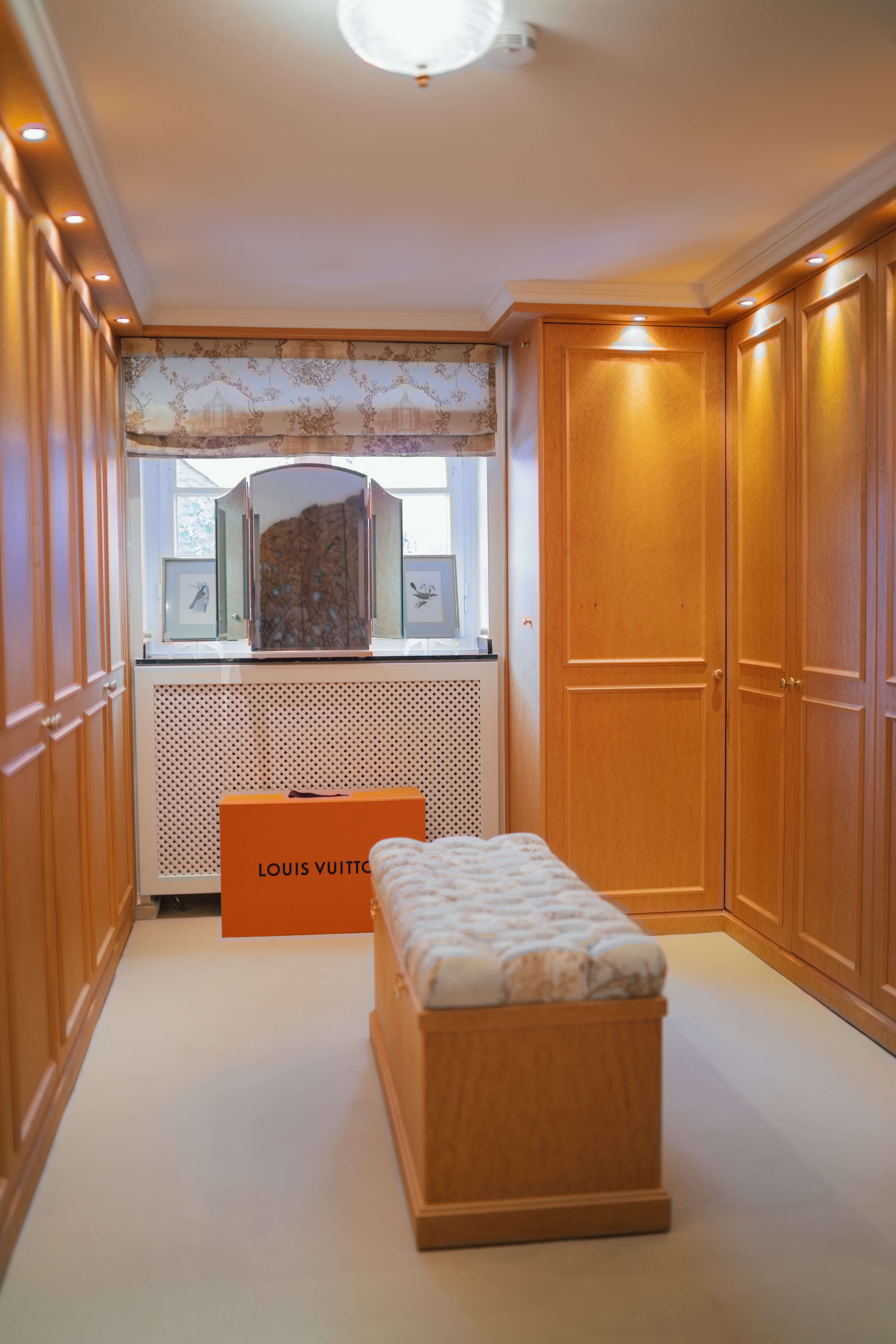 Im hinteren Bereich des Wohnzimmers befinden sich zwei Schlafzimmer, von denen eines derzeit als Ankleidezimmer mit maßgefertigten, massiven Einbauschränken genutzt wird. Das Hauptschlafzimmer bietet viel Platz und hohen Wohnkomfort.