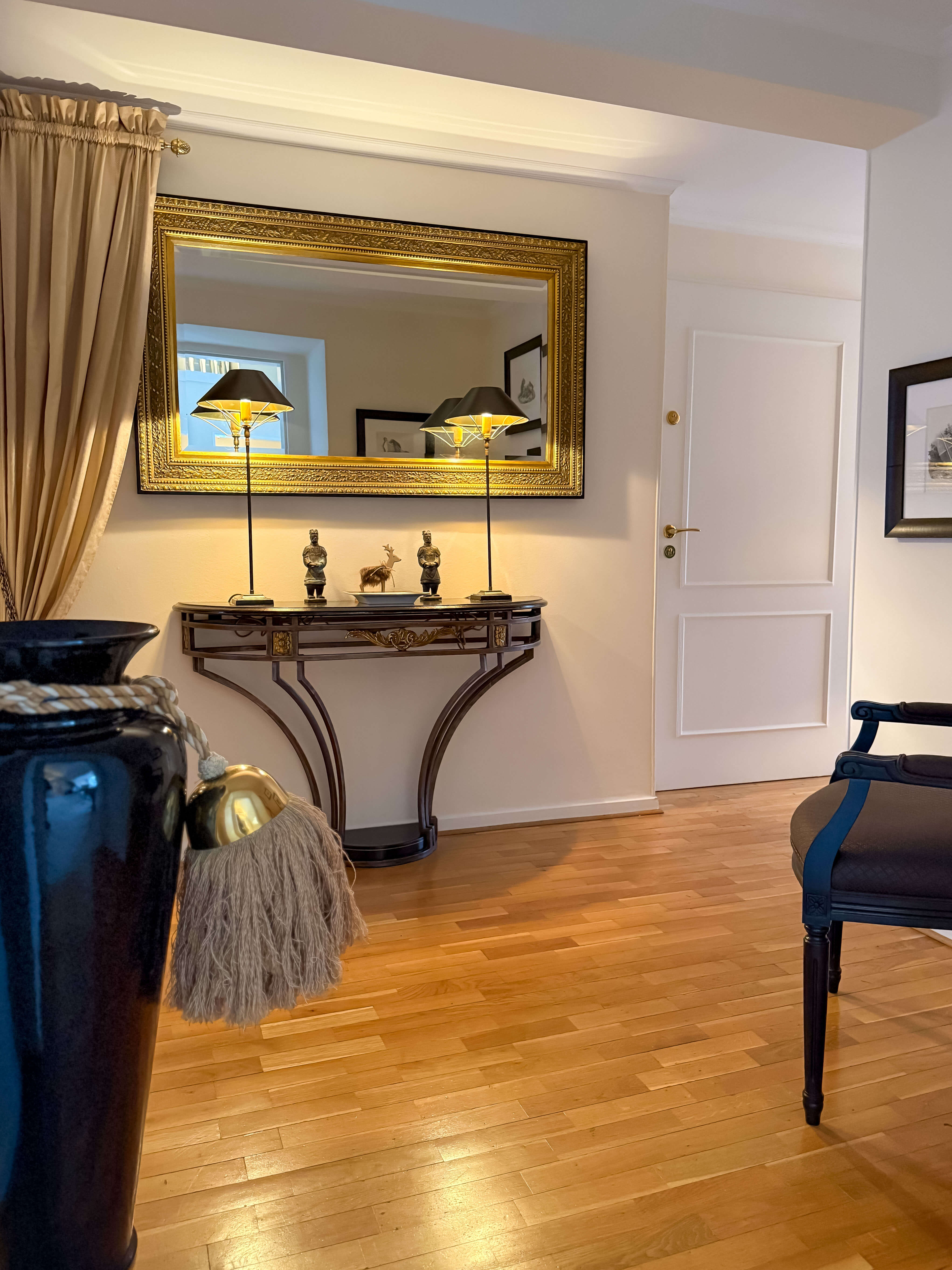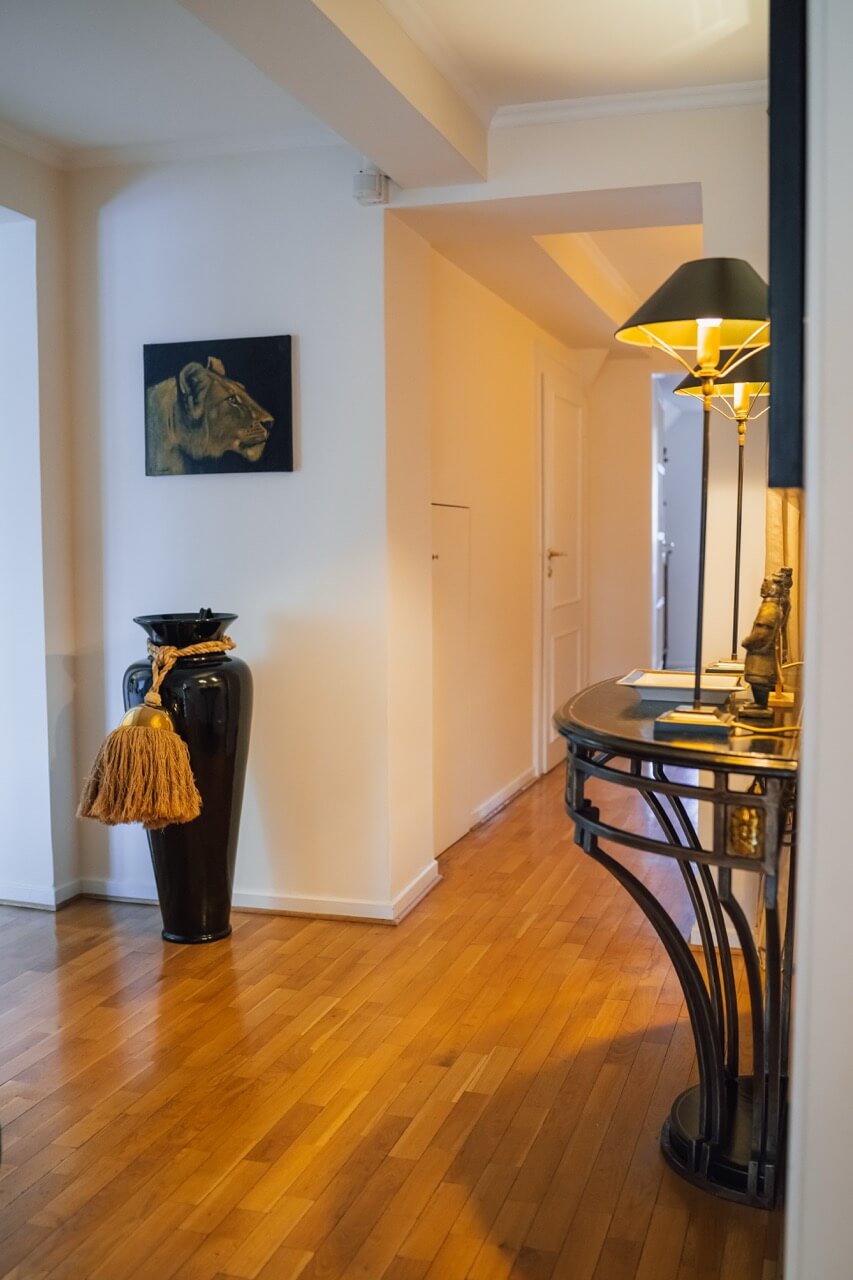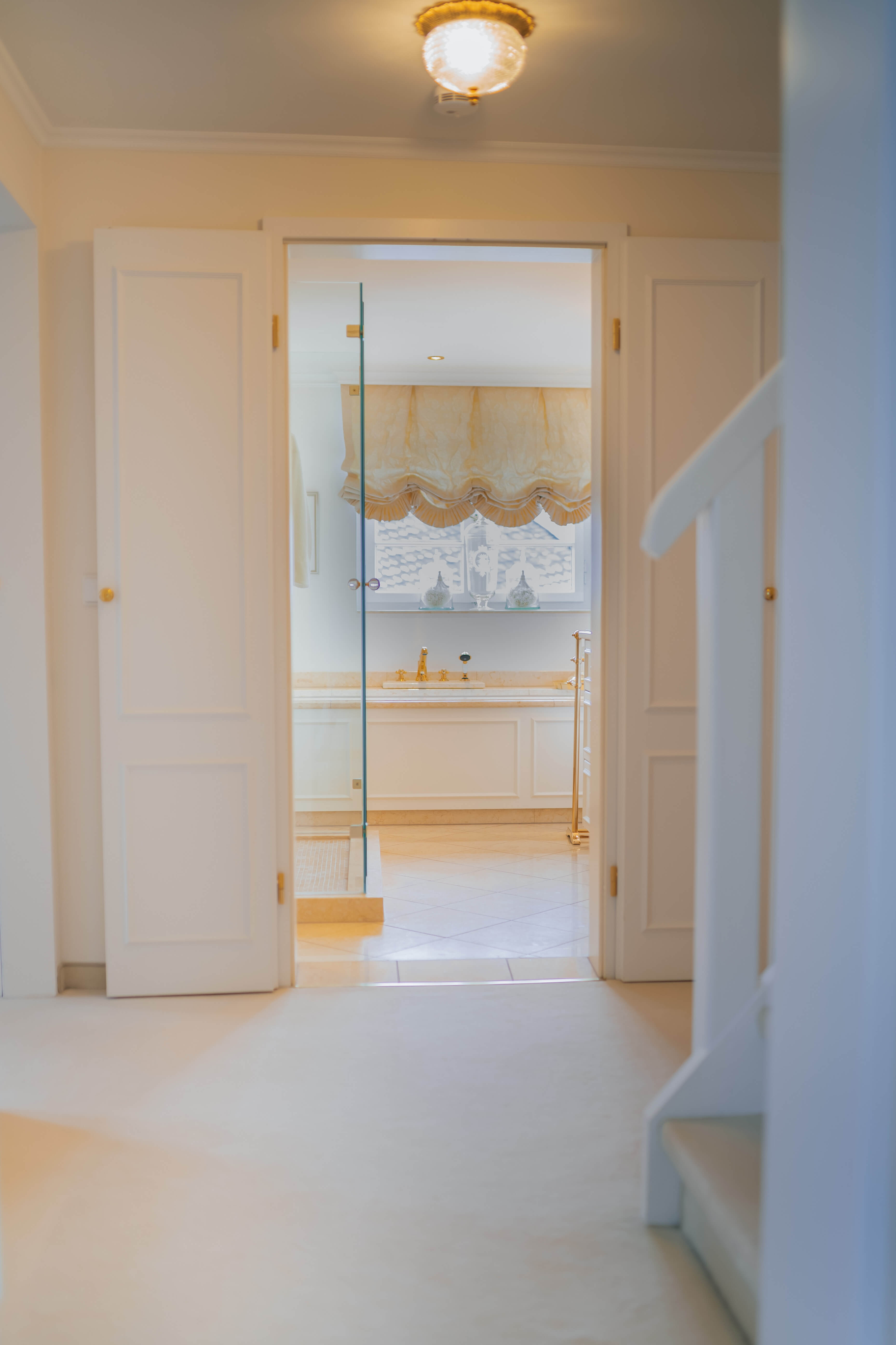 Das Entrée, der Flur zur Küche sowie das Esszimmer sind mit Echtholzparkett versehen. Der Wohnbereich, die Galerie, das Schlafzimmer sowie der Ankleidebereich verfügen über einen hochwertigen, beigefarbenen Teppichboden, der den Räumen einen besonderen Wohlfühlcharakter verleiht. Das Gäste-WC sowie das luxuriöse Badezimmer sind ebenfalls mit ägyptischem Marmor ausgestattet.