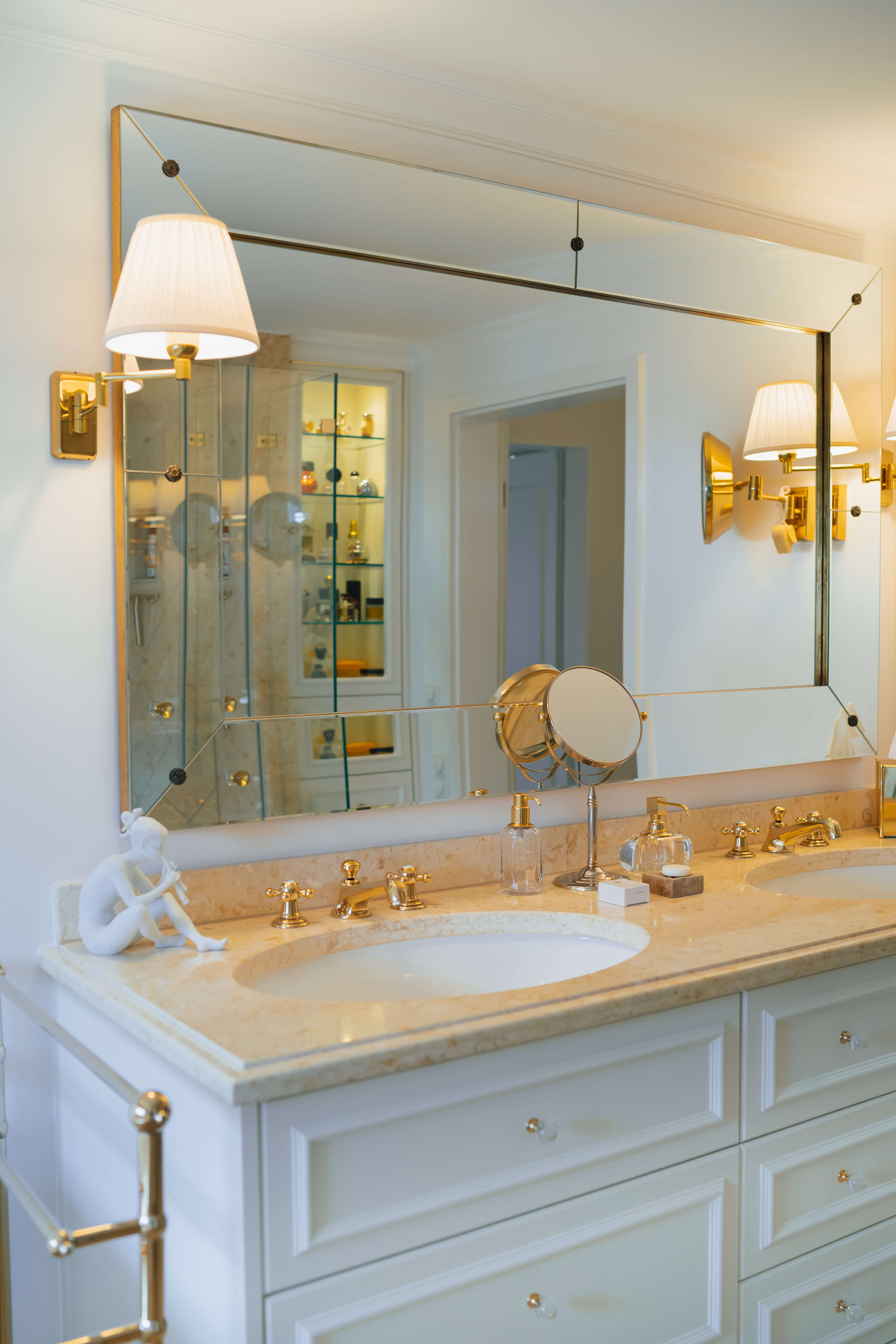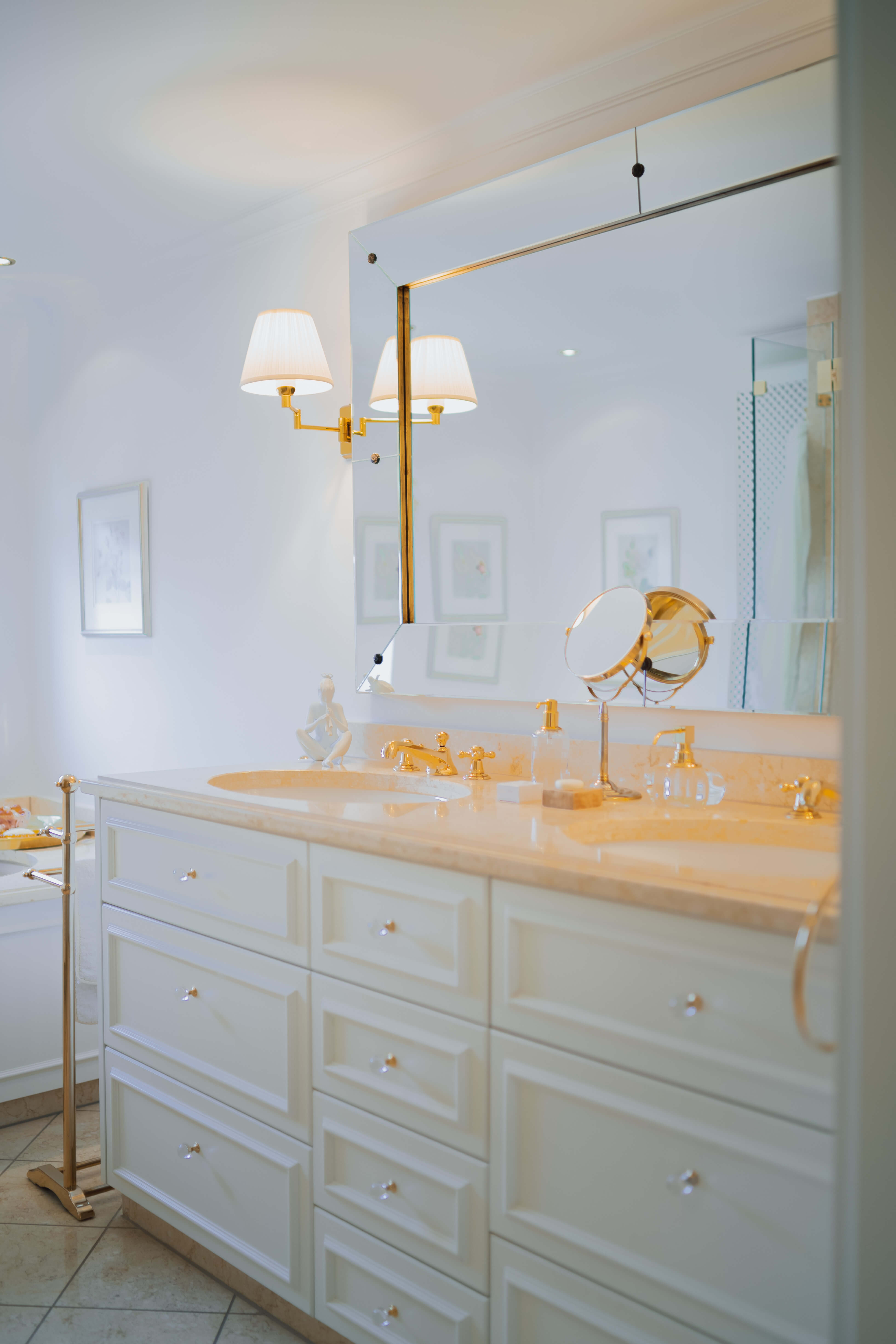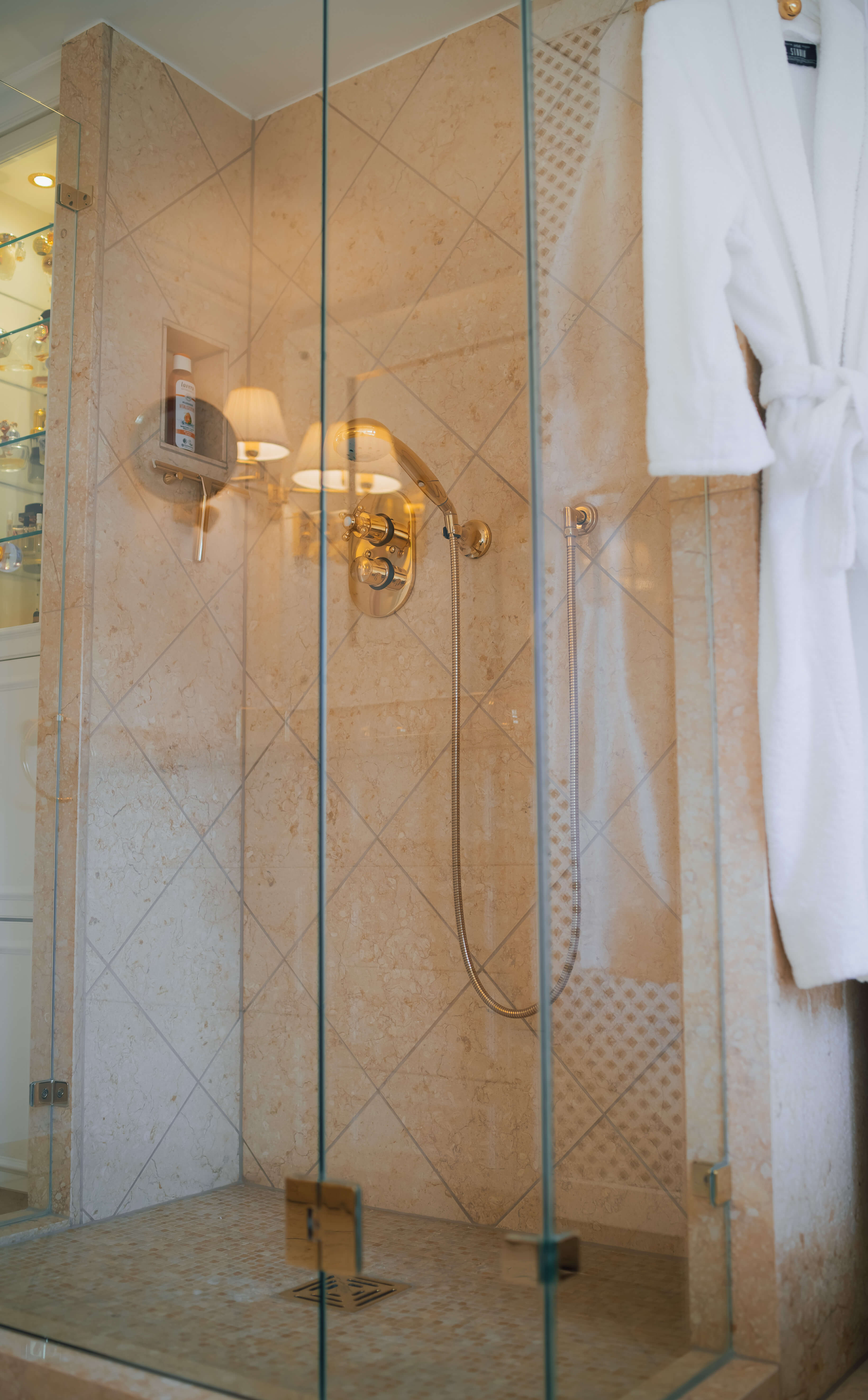 Das luxuriöse Badezimmer erinnert mit seiner Ausstattung an ein französisches Luxusbad und lässt keine Wünsche offen. Es ist vollständig mit edlem ägyptischem Marmor ausgestattet und verfügt sowohl über eine Badewanne als auch über eine hochwertige Dusche.