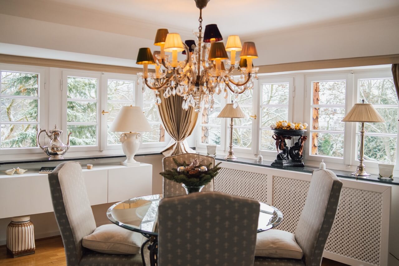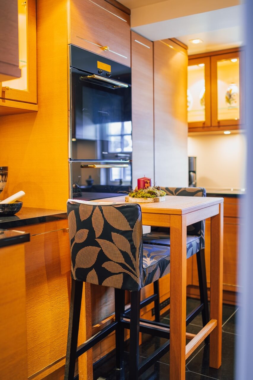 Rechts vom Entrée ausgehend gelangt man über einen Flur zur maßgefertigten Küche, die von einem Schreinermeister mit viel Liebe zum Detail gefertigt wurde. Sie ist mit einer hochwertigen schwarzen Granitarbeitsplatte sowie einem passenden Granitboden ausgestattet. Das angrenzende Esszimmer überzeugt durch den Charakter eines großzügigen Erkers und wird dank der großen Fensterfronten lichtdurchflutet.