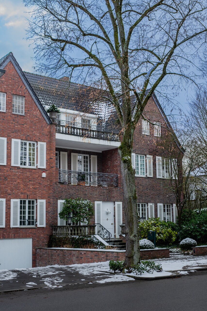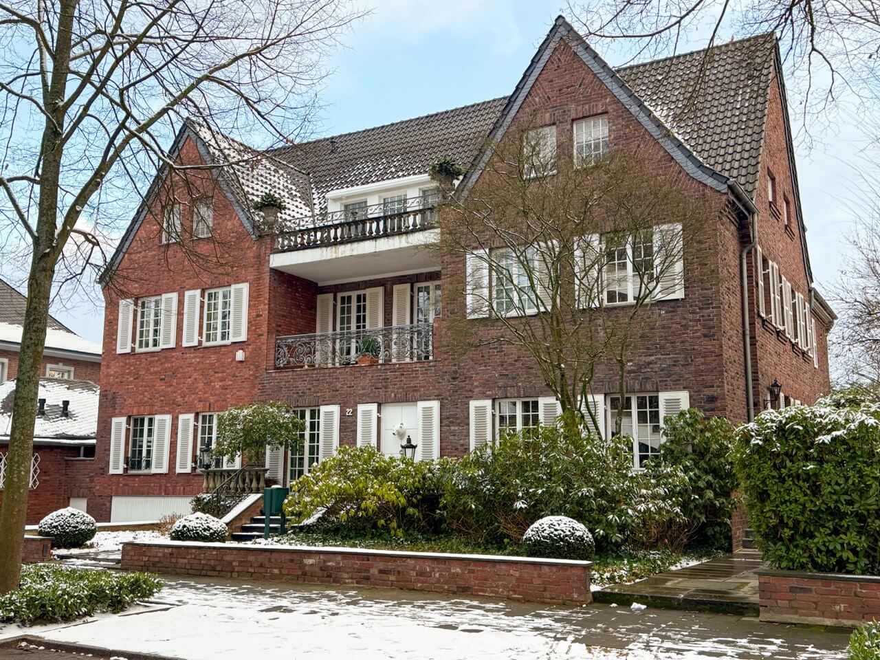 Zusätzlich verfügt die Wohnung über einen charmanten Balkon zur Hindenburgstraße, der mit einer Markise ausgestattet ist. Im gesamten Haus wurden Holz-Sprossenfenster verbaut, die dem Gebäude einen besonderen architektonischen Charakter verleihen.